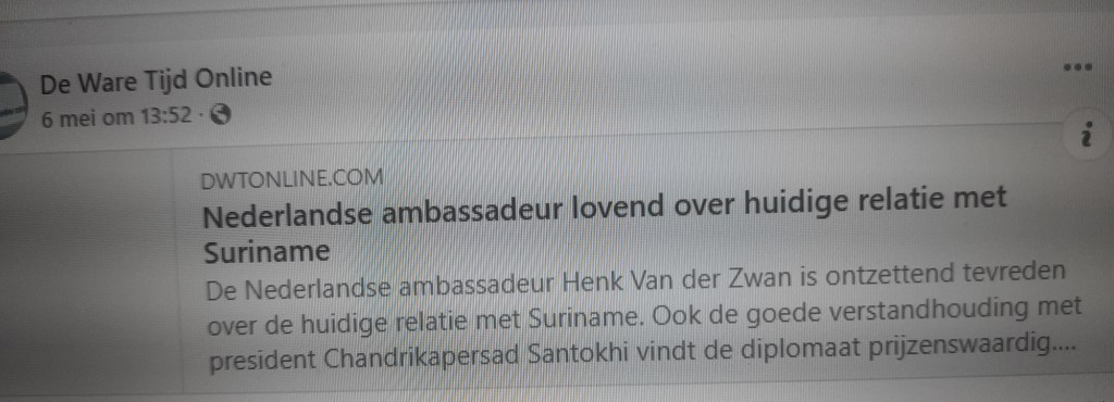 Maar goed. Het artikel is van de website af. Ik wil geloven dat zowel u als de ambassadeur er ongemakkelijk van werden en daarom de krantredactie vroegen om verwijdering. Boven deze tekst plaatste ik een van mijn beeldscherm zelfgemaakte foto van de krantenkop van het artikel. Om ons eraan te herinneren dat de oude route onvruchtbaar is en in elk geval Suriname niet dient en nooit gediend heeft.